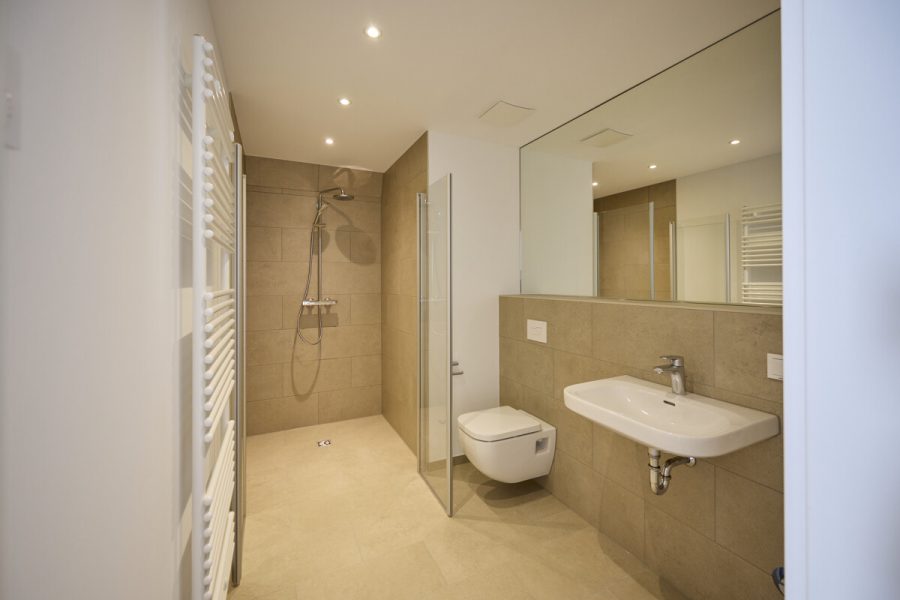 -Stilvolles Duschbad mit bodengleicher Dusche, Waschbecken und WC (innenliegend)