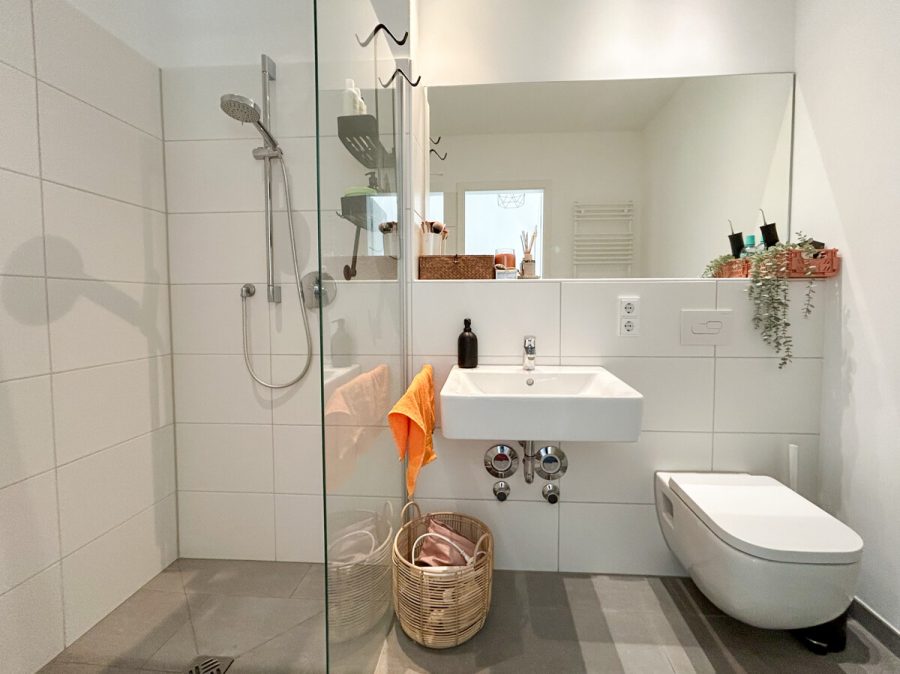 -Stilvolles Duschbad (innenliegend) mit bodengleicher Dusche, Waschbecken, WC, großem Spiegel und Handtuchheizkörper